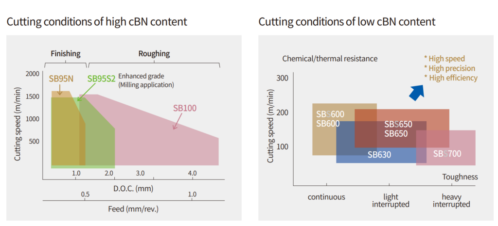 High cBN content | SB100 | Extreme wear resistance due to high content of coarse cBN grain | Rough machining of cast iron and powder metal alloys |