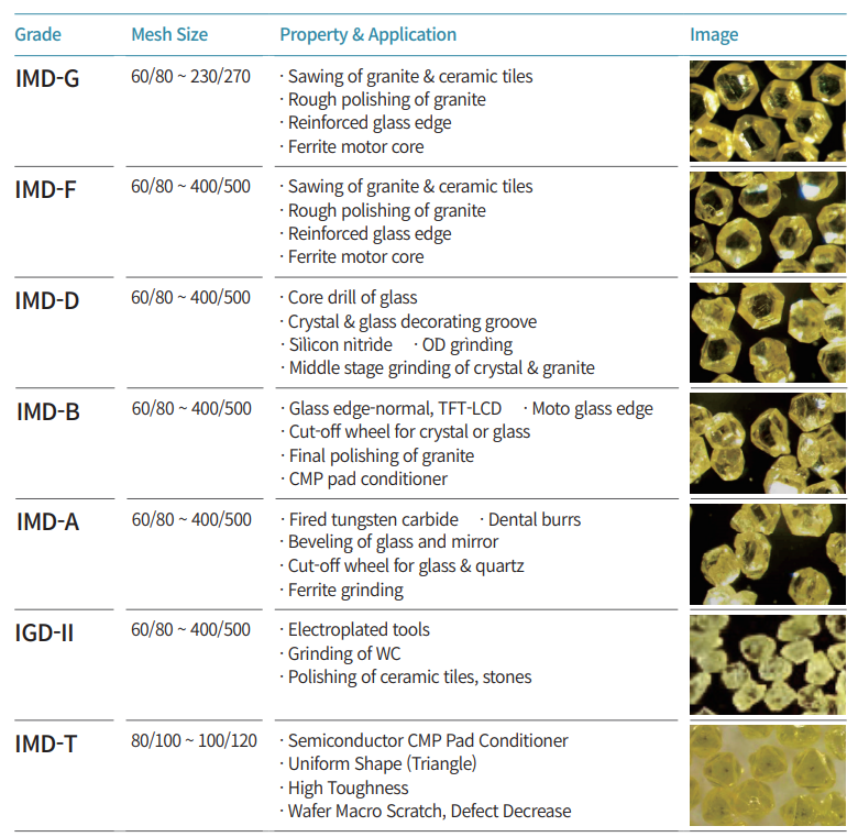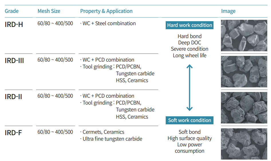 Characteristics | Very good surface finishing | Good surface finishing | General purposes | General purpose, Easy wire cutting and Good impact resistance | Good wear resistance with special binder and diamond bonding | Excellent wear resistance with strong diamond bonding | Excellent impact resistance and Easier tool fabrication | Specially designed for superior wear resistance |