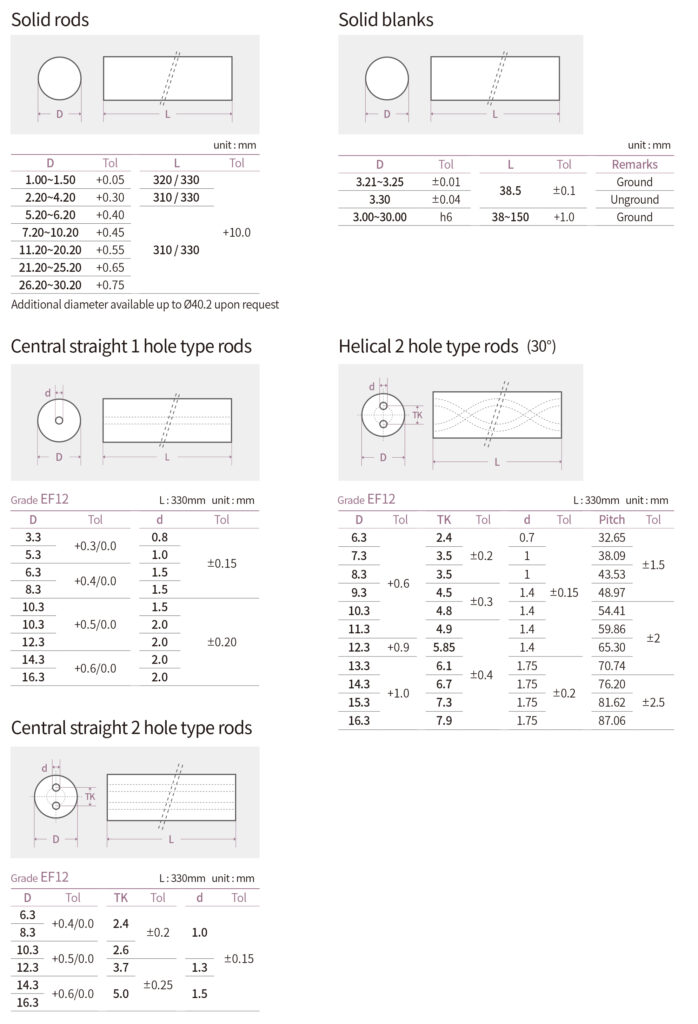 ประเภทของทังสเตนคาร์ไบด์ร็อดจำแนกตามการใช้งาน: ดอกสว่านทั่วไป ดอกเร้าเตอร์สำหรับดอกเอ็นมิลและแผ่น PCB ดอกสว่านขนาดเล็ก นำไปใช้กับกระบวนการต่างๆ ของวัสดุชิ้นงานในด้านยานยนต์ อากาศยาน พลังงาน ไอที และยาที่ต้องการการตัดด้วยซีเมนต์คาร์ไบด์ วัสดุจำแนกตามปริมาณ Co ความแข็งของวัสดุชิ้นงานและการใช้งาน