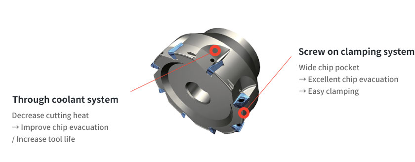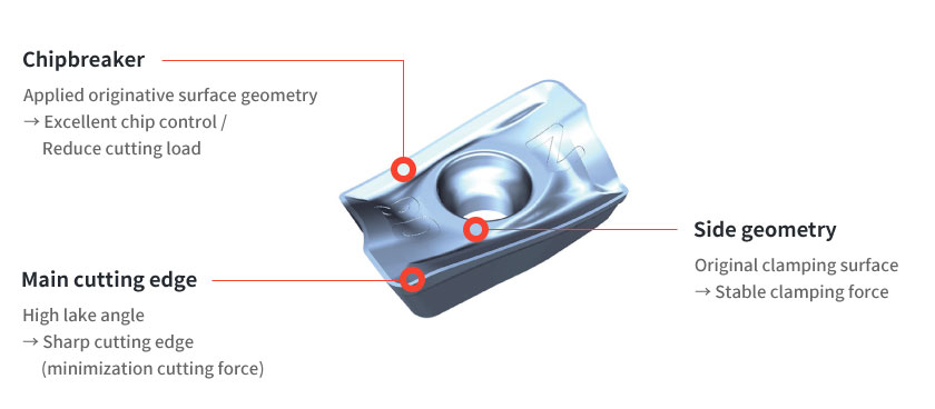 – Longer tool life and minimization cutting force with high lake angle cutting edge and enhanced edge resistance