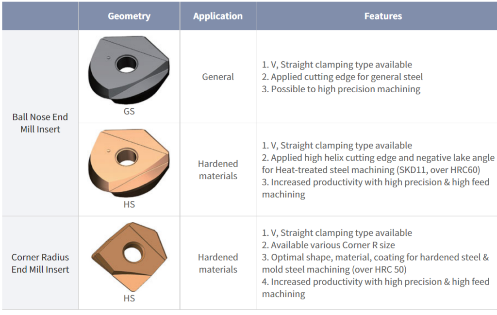 – Optimized in finishing machining ISO S, M materials – Prevents B.U.E with sharp edge – Enhanced chip evacuation – High rake angle applied in side cutting edge (→ Minimize cutting forces and heat resistance) |
