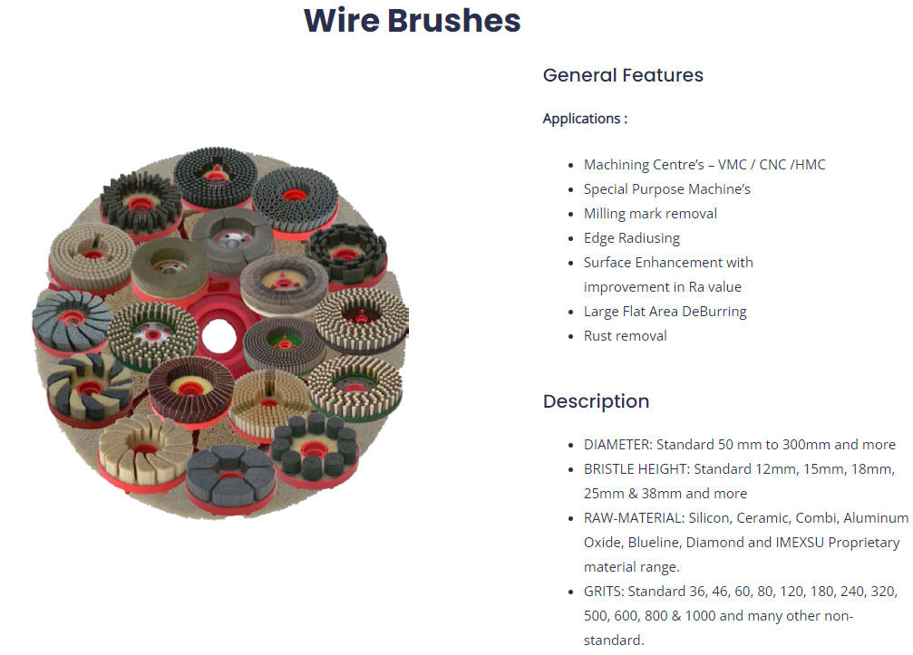 นวัตกรรมแปรงลบคมและตกแต่ง ด้าม เครื่องมือ และเครื่องจักรอเนกประสงค์ สำหรับอุตสาหกรรมขนาดย่อมถึงหนัก เช่น รถยนต์ การบิน การบิน ปิโตรเลียม อาวุธยุทโธปกรณ์ ทางทะเล โครงสร้างพื้นฐาน กังหัน วิศวกรรม และ อื่น ๆ อีกมากมาย
